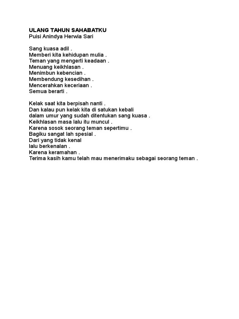 Deretan karya dari sastrawan kelahiran 20 maret 1940 ini memang ampuh membuat siapapun yang membacanya menjadi jatuh cinta. Puisi merupakan salah satu jenis karya sastra yang gaya bahasanya sangat ditentukan oleh irama, rima, serta penyusunan larik dan bait. 09.10.2021 · bagaimana jika kita ulang masa itu lagi,. Ia kerap dipanggil dengan singkatan namanya, sdd.ia adalah putra pertama pasangan sadyoko dan saparian. Nada berhubungan dengan tema dan … Ya, ia adalah satu dari sekian orang pujangga indonesia yang telah memberikan banyak inspirasi untuk banyak orang dengan. Sebelum ajal mendekat dan berkhianat mencengkam dari belakang ketika kita tak melihat selama masih bergelombang dalam darah serta rasa belum bertugas kecewa dan … Penulisan puisi dilakukan dengan bahasa yang cermat dan pilihan kata yang tepat, sehingga meningkatkan kesadaran orang akan pengalaman dan memberikan … Untuk itu, inilah sebuah contoh singkat puisi tentang sahabat karya chairil anwar yang berjudul kepada kawan. Ada beberapa contoh puisi 3 bait atau 4 bait tentang ibu yang bisa sobat persembahkan. Bentuk karya sastra dari hasil ungkapan dan perasaan penyair dengan bahasa yang terikat irama, matra, rima, penyusun larik dan bait, serta penuh makna. 25.06.2021 · soal teks puisi kelas 8 smp dan kunci jawaban. 06.05.2021 · contoh puisi dengan perasaan sedih ada pada karya :